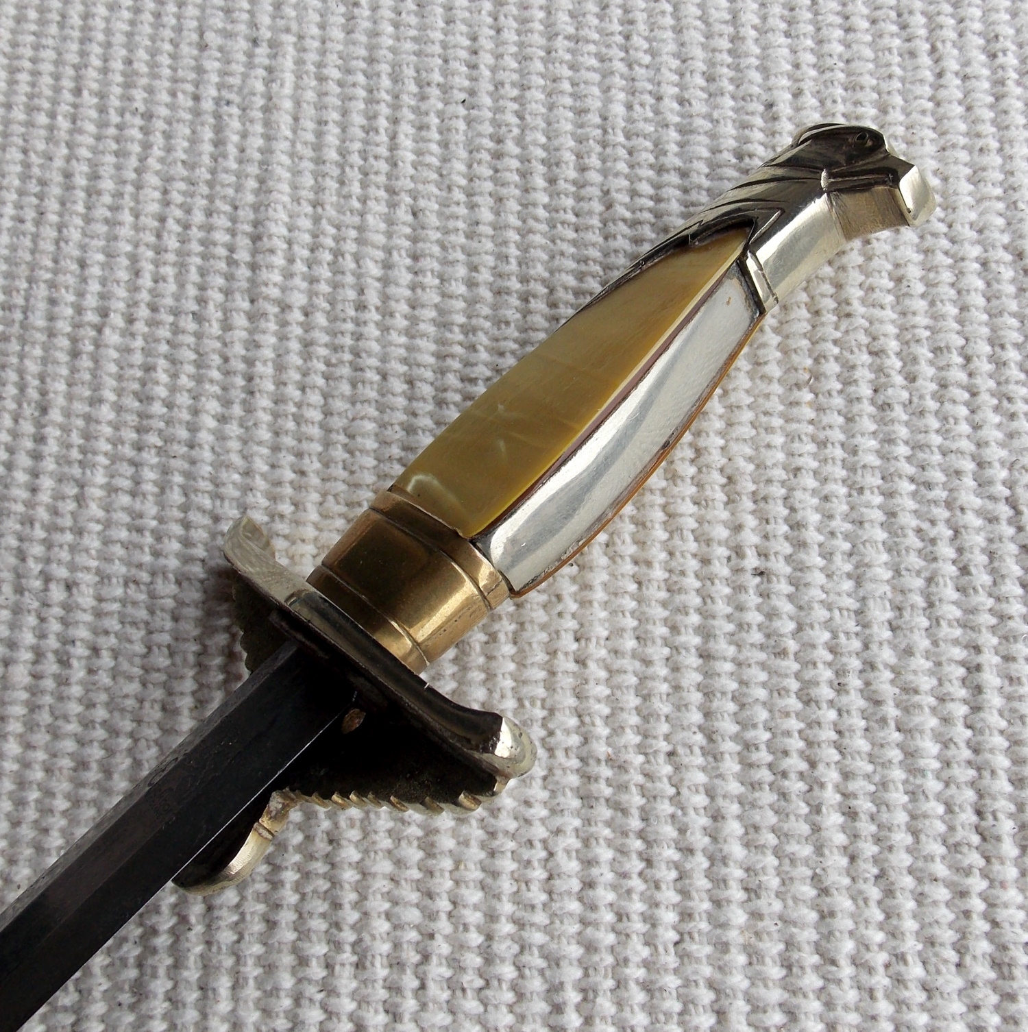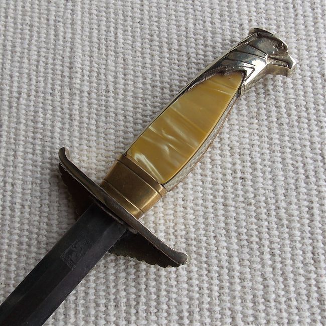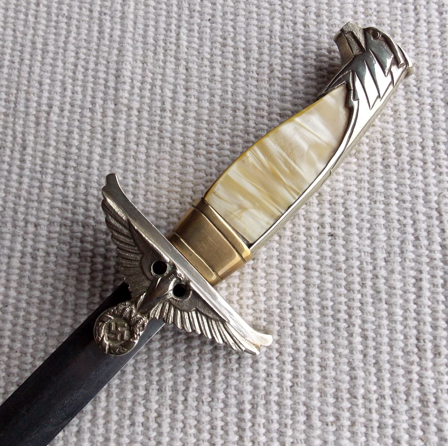 Эфес состоит из крестовины и рукояти. Рукоять из цветного металла, в позолоте, с перламутровыми щечками. Крестовина рукояти с загнутыми концами вверх. С одной стороны на крестовине помещено декоративный щитик с рельефным изображением имперского орла с венком зажатым в когтях, в венке свастика. Весь металлический прибор рукояти позолочен, все покрытие отлично сохранено.