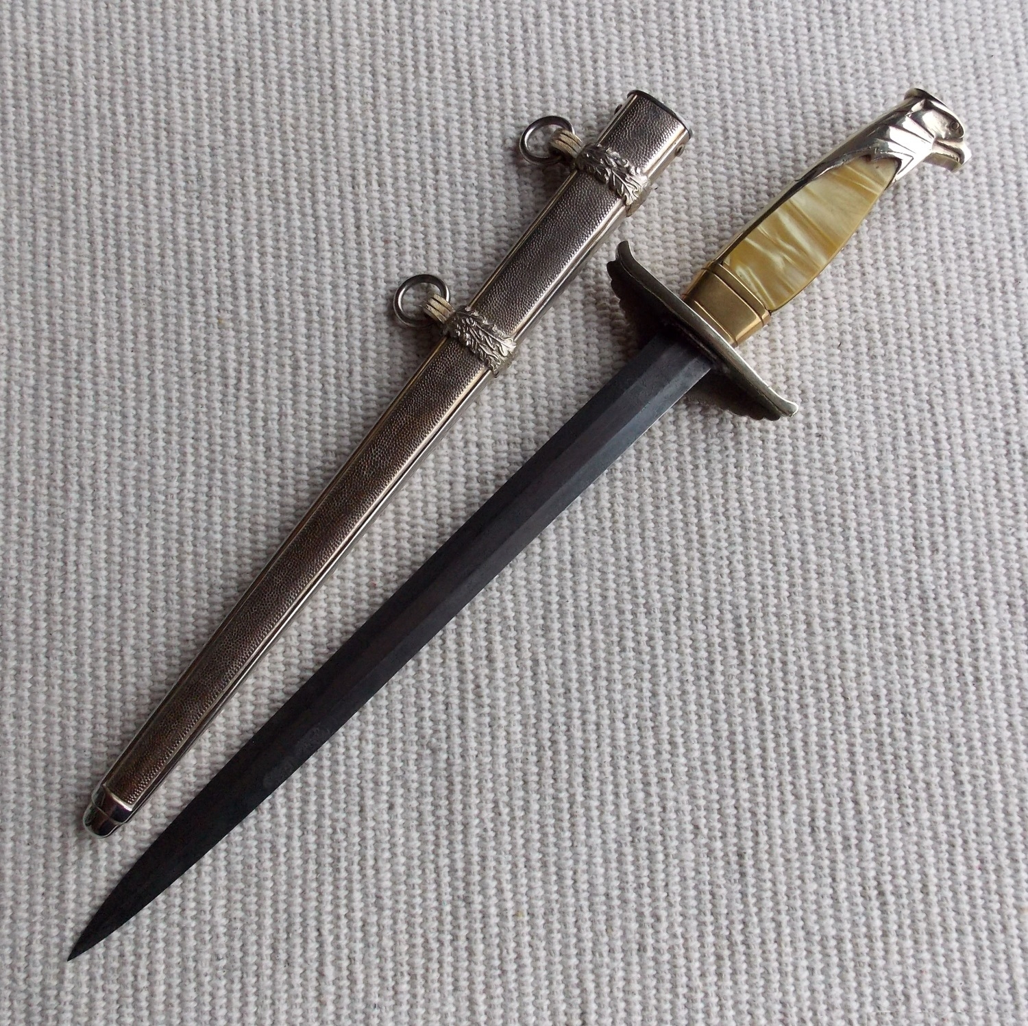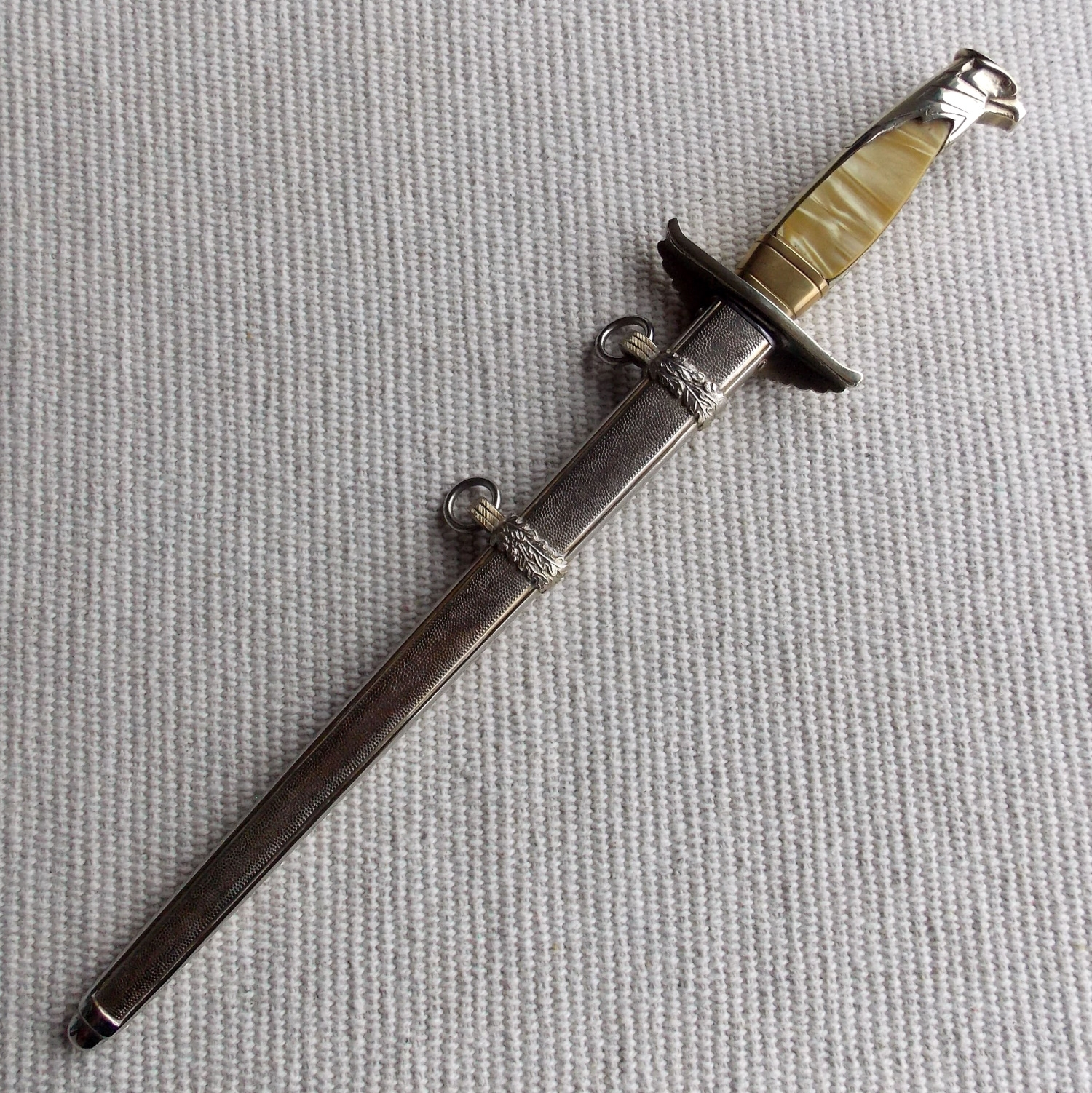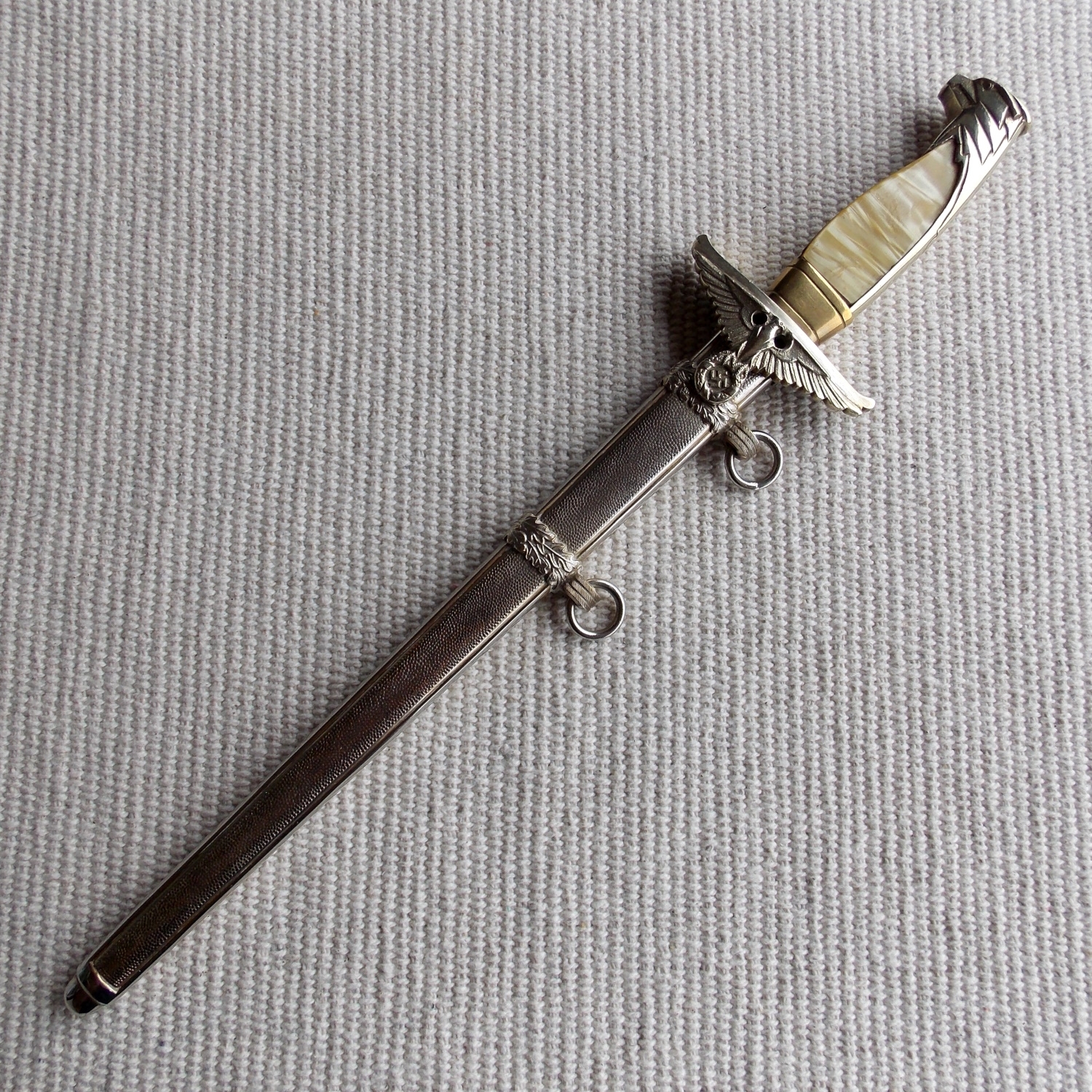 Эфес состоит из крестовины и рукояти. Рукоять из цветного металла, в позолоте, с перламутровыми щечками. Крестовина рукояти с загнутыми концами вверх. С одной стороны на крестовине помещено декоративный щитик с рельефным изображением имперского орла с венком зажатым в когтях, в венке свастика. Весь металлический прибор рукояти позолочен, все покрытие отлично сохранено.