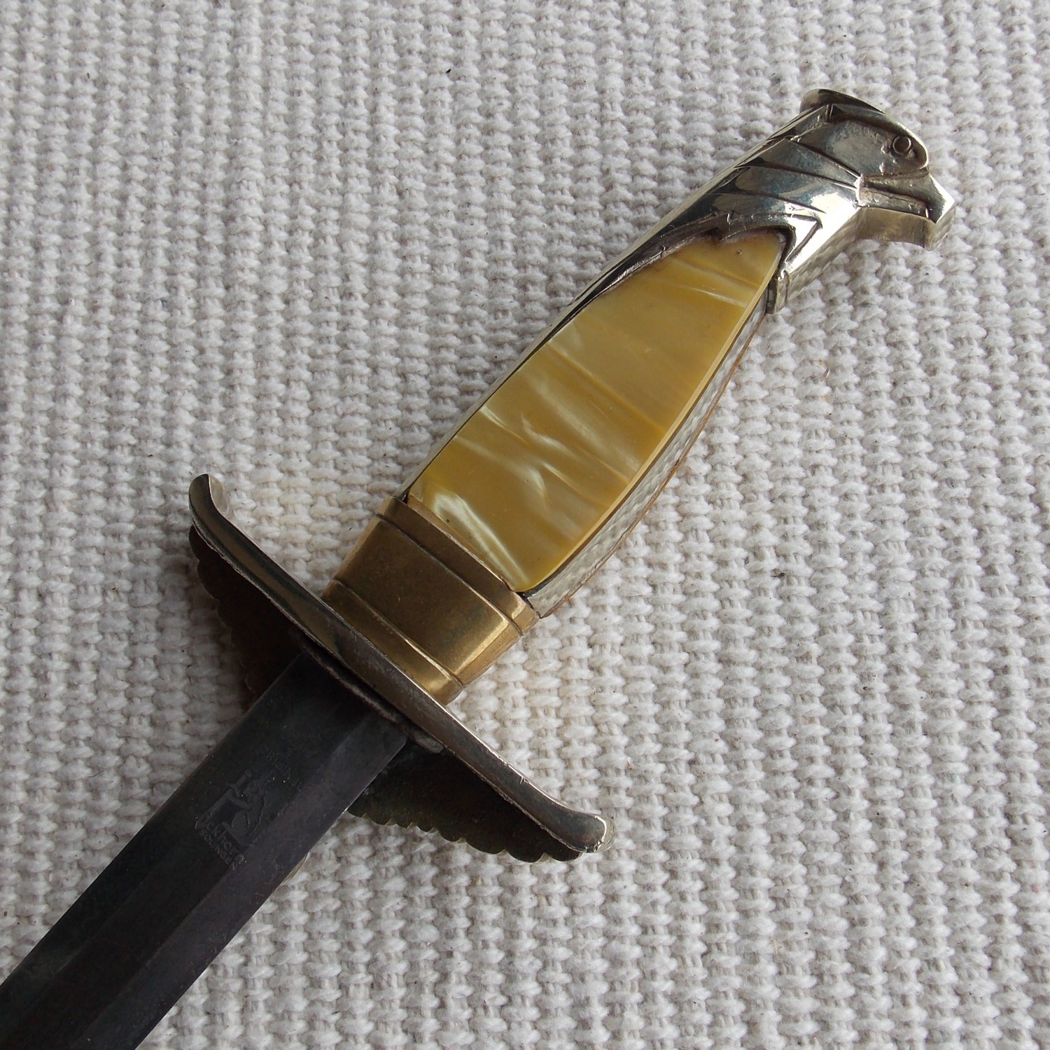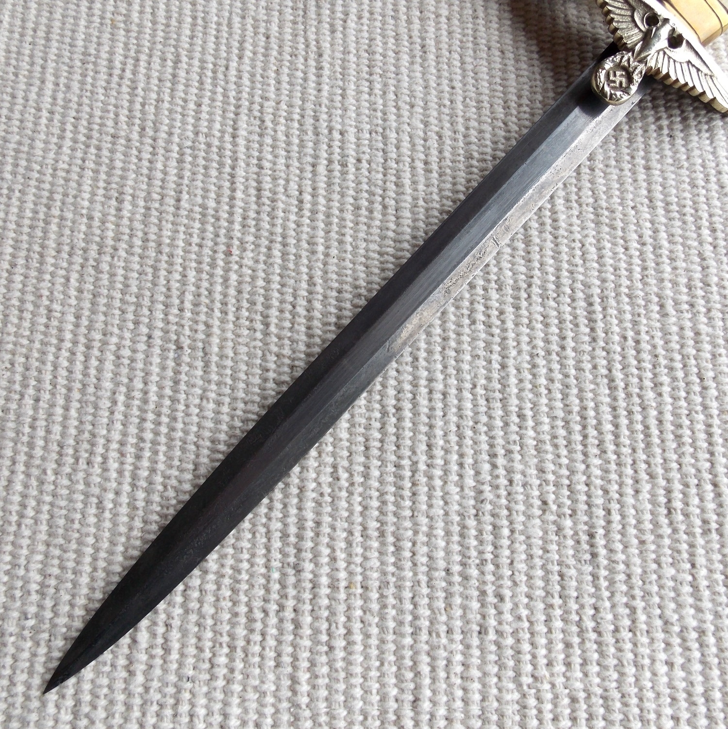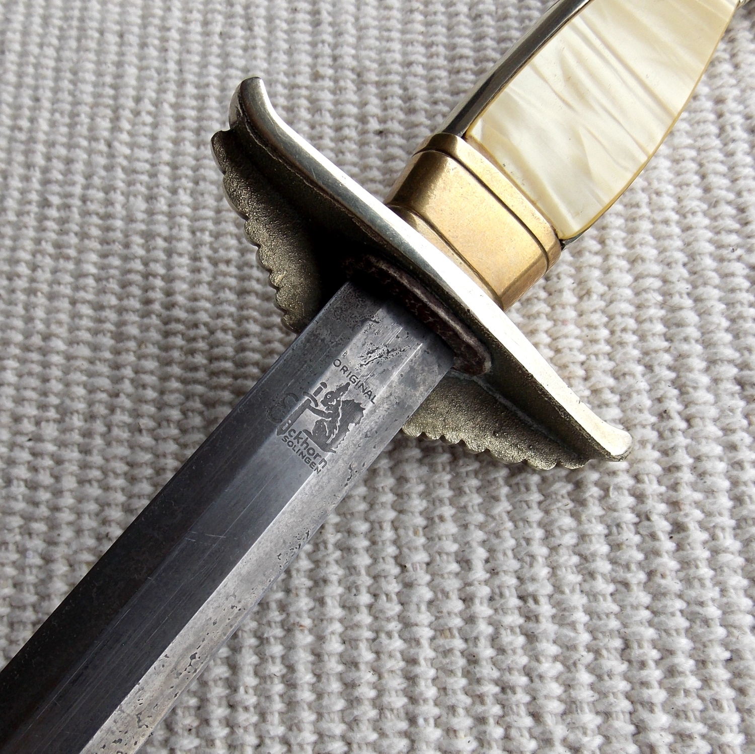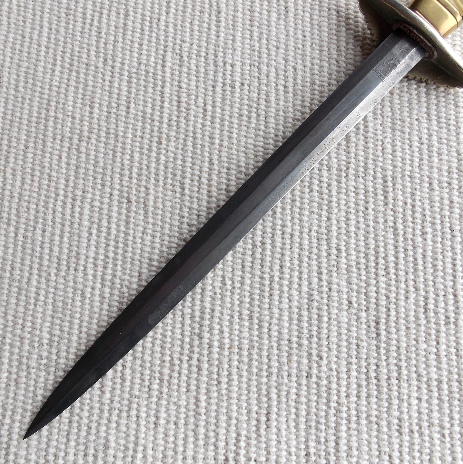 Клинок стальной, прямой, двулезвийный, шестигранный в сечении, без долов, магнитный, в старой патине. В основании клинка нанесено изображение и клеймо «ORIGINAL Eickhorn, Solingen».