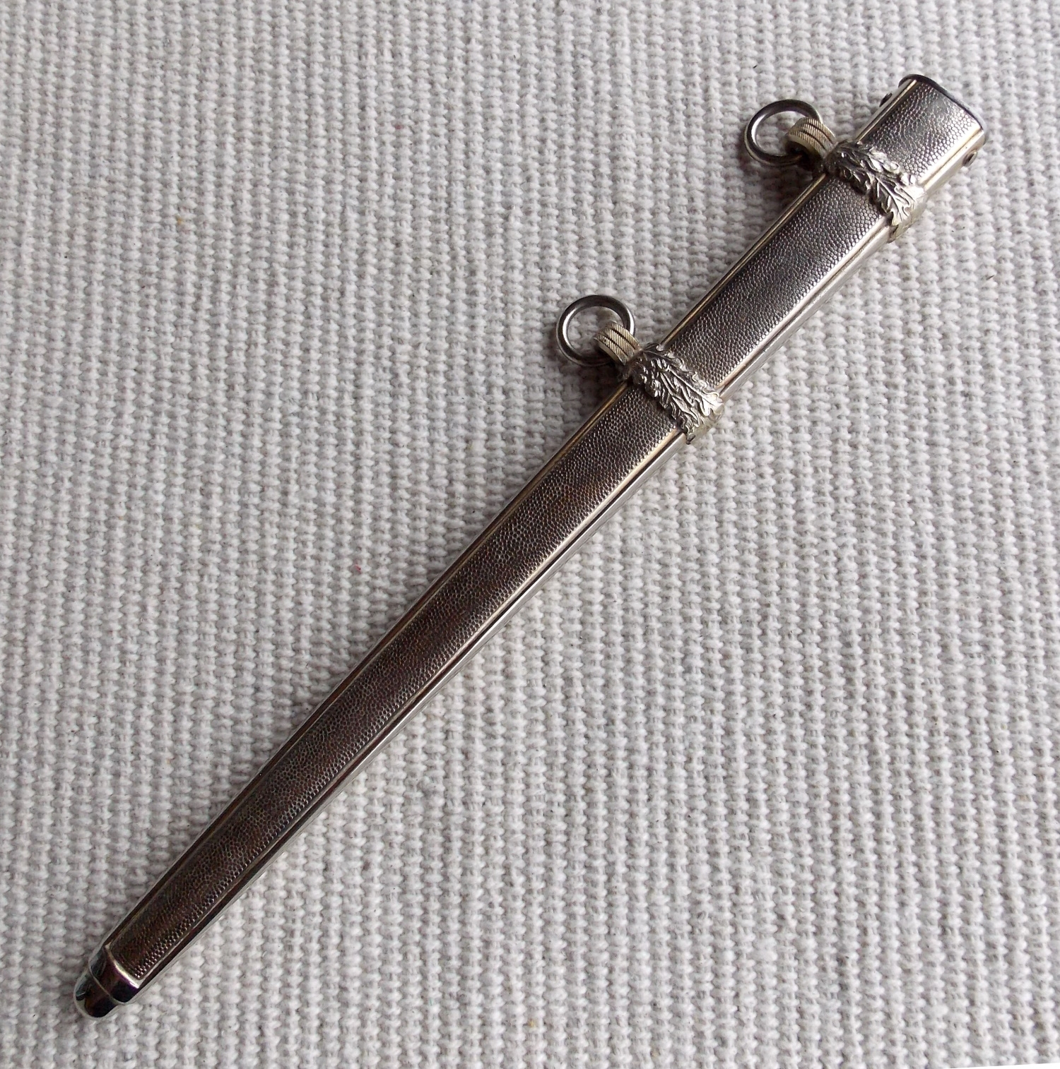 Ножны стальные, магнитные, с двумя накладными орнаментированными узором из лавровых листьев гайками и кольцами. Покрытие - позолота, отлично сохранена.