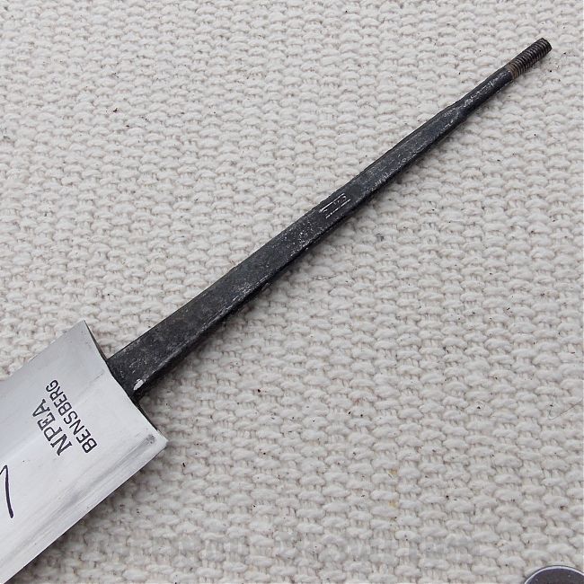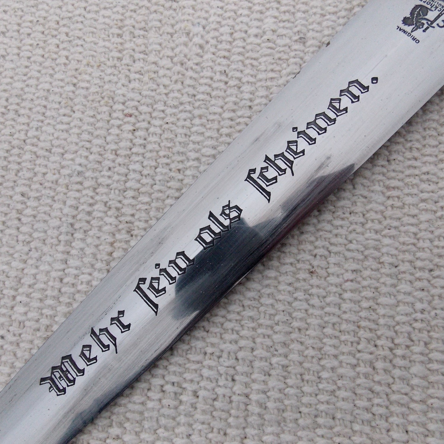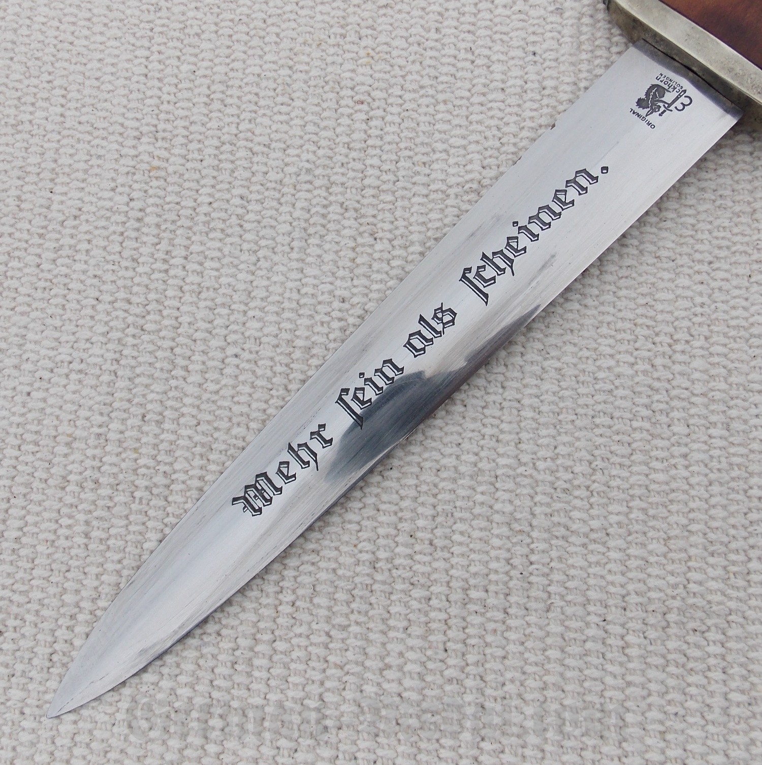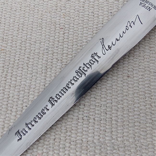 Клинок стальной, прямой, двулезвийный, 4-гранный в сечении, без долов, в отличном состоянии, без корозии и тёмных пятен, хорошо просматривается фабричная обработка металла - кроссгрейдинг. На клинке, с одной стороны,  готическим шрифтом нанесена надпись «Mehr Sein als Scheinen.» (быть лучше, чем кажешься) и у большой гарды (крестовины) нанесено клеймо фирмы производителя «Carl Eickhorn, Solingen». На другой стороне клинка нанесена дарственная надпись «In treuer Kameradschаft Holthoff» (в верном товариществе Холтхофф) и у большой гарды название школы «NPEA Bensberg».