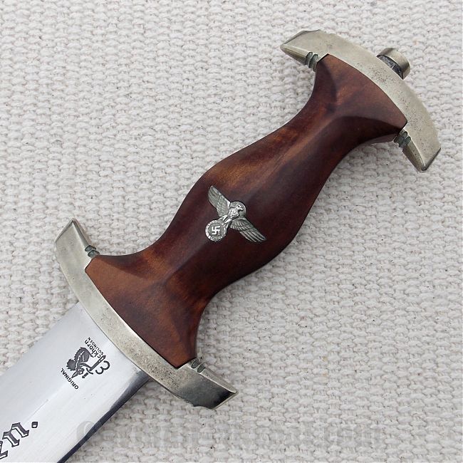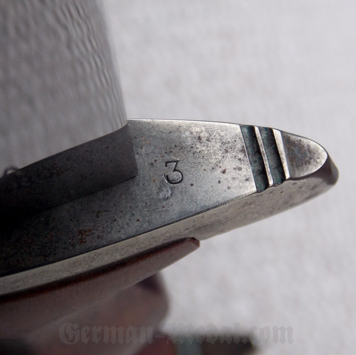 Эфес состоит из рукояти, металлической верхней гарды и крестовины. На рукояти выполненной из тёмно-коричневого дерева, располагается мельхиоровый имперский орёл со свастикой, рукоять без трещин и сколов. Крестовина и гарда в мельхиоре, на внутренней стороне выбито одинаковое клеймо "НЕ", на крестовине со стороны клинка - технологическое клеймо "3". На хвостовике клинка присутствует кузнечное клеймо, грани винта не сбиты.