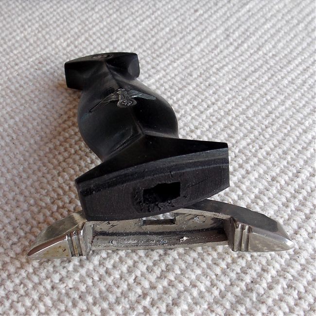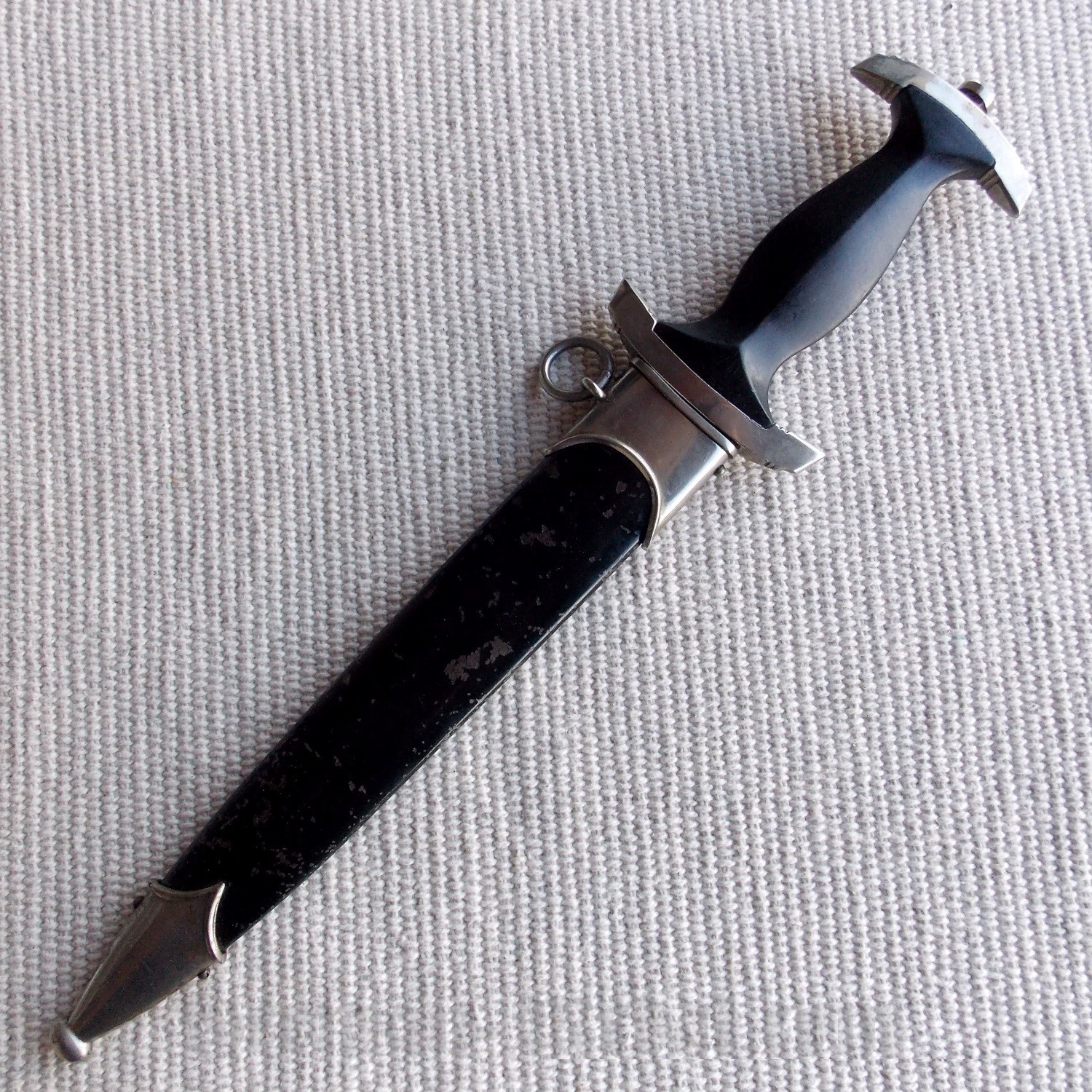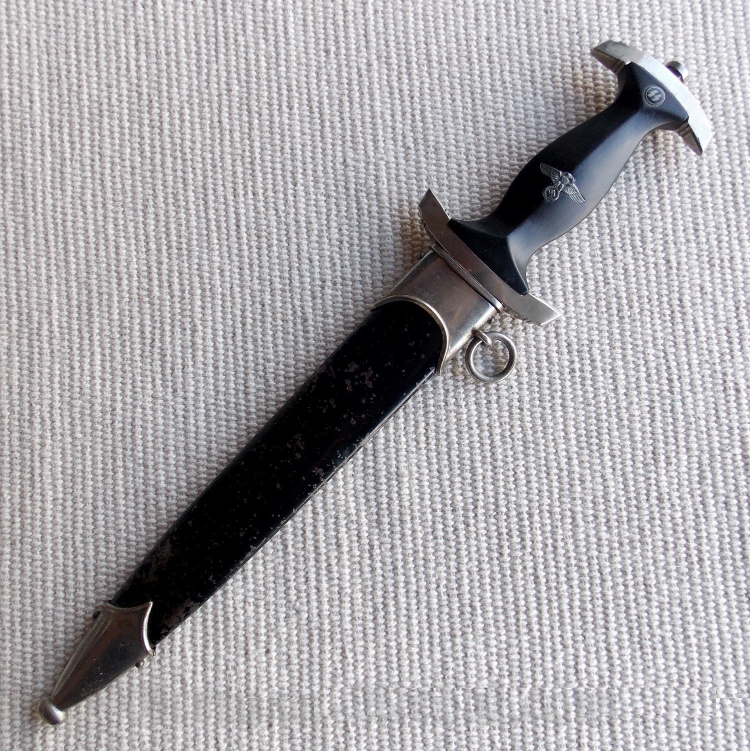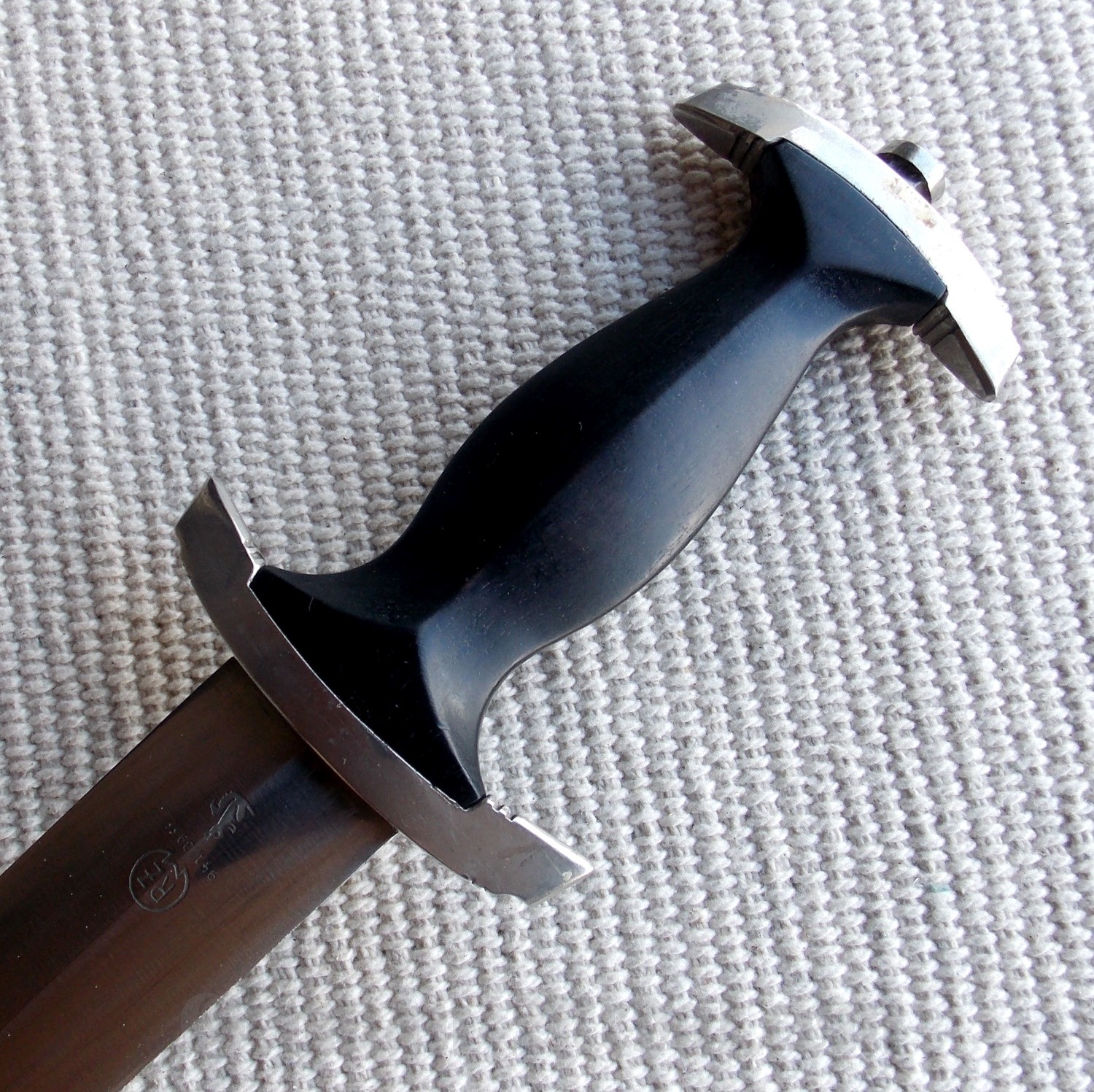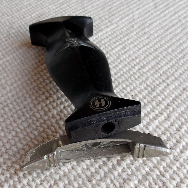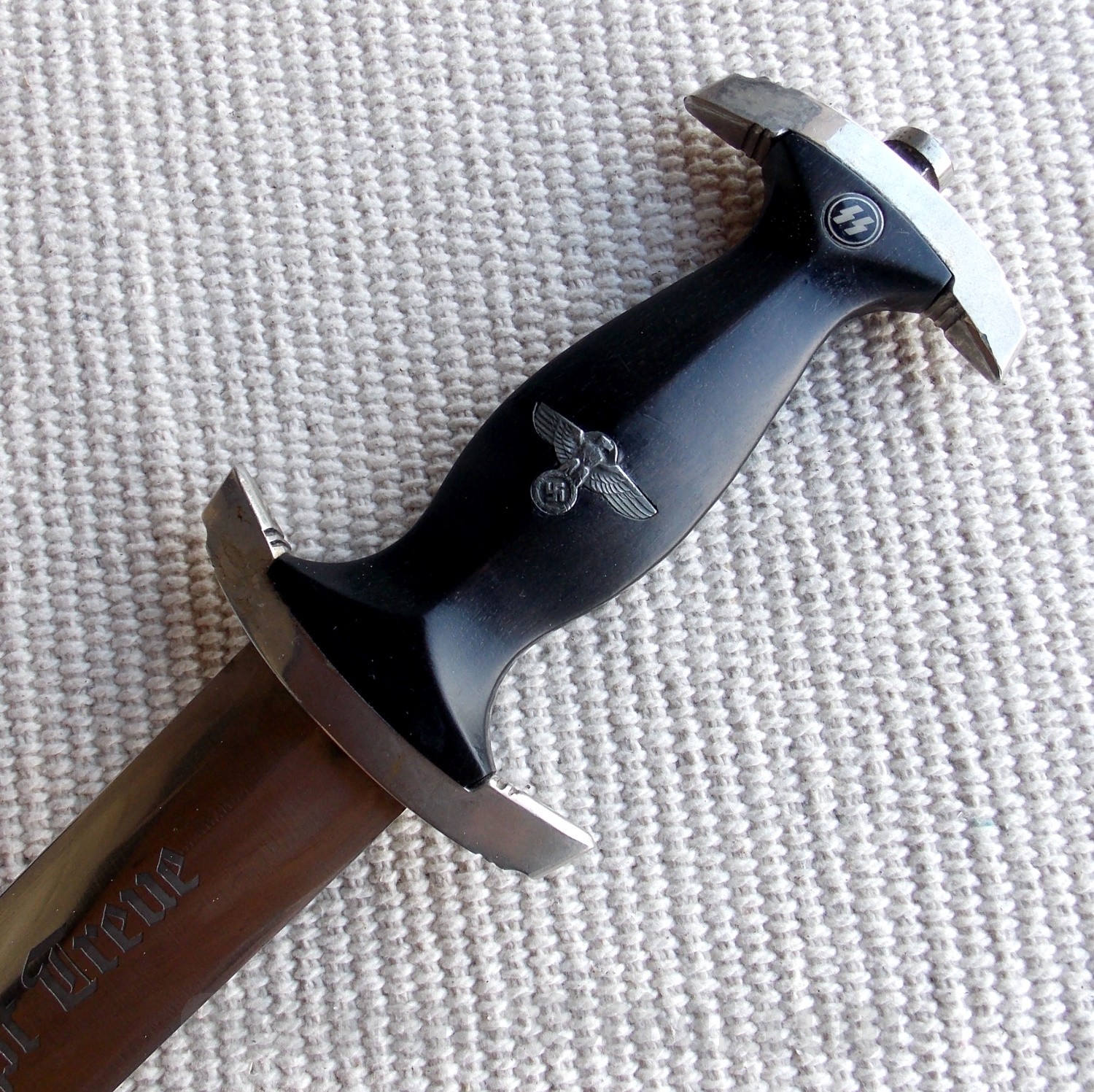 Рукоять черного дерева, цельная и плотная, без трещин и сколов. В верхней части имеет вставку в виде черного эмалевого глазка с рунами, эмаль без трещин и сколов. В средней части, вставка в виде орла СС, изготовленная из алюминия, орёл не чищен в старой патине и налёте. Крестовина и навершие (гарды) никелированные, в старой патине и налёте, грани винта не сбиты.