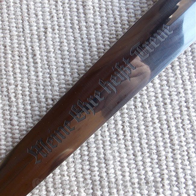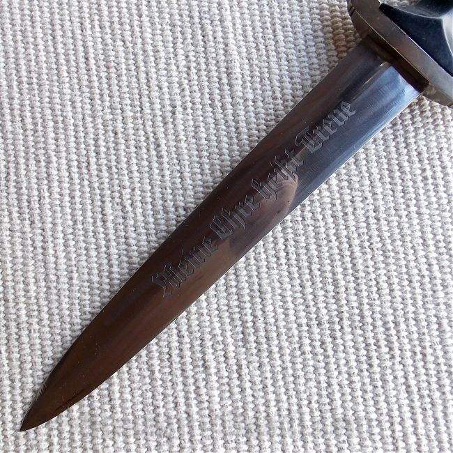 Клинок стальной, прямой, полированный, ромбического сечения, двулезвийный, без долов. В отличном состоянии, не точен и не полирован, слегка в старой патине,  хорошо видна заводская обработка металла (кроссгрейдинг). На клинке травлением нанесена надпись «Meine Ehre Heisst Treue». У основания клинка нанесено клеймо производителя "RZM 941/39 SS" и нанесена отдельно белка (тип клейма "крыса"). На концевике клинка находится выпуклое кузнечное клеймо производителя заготовки.