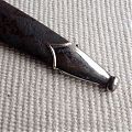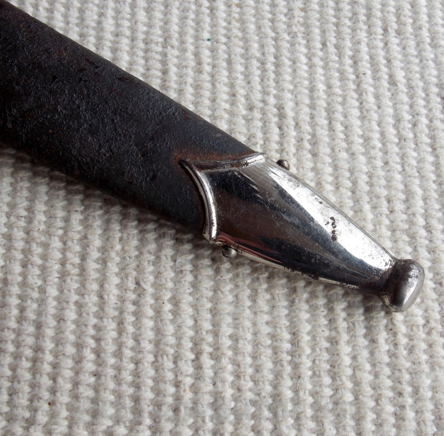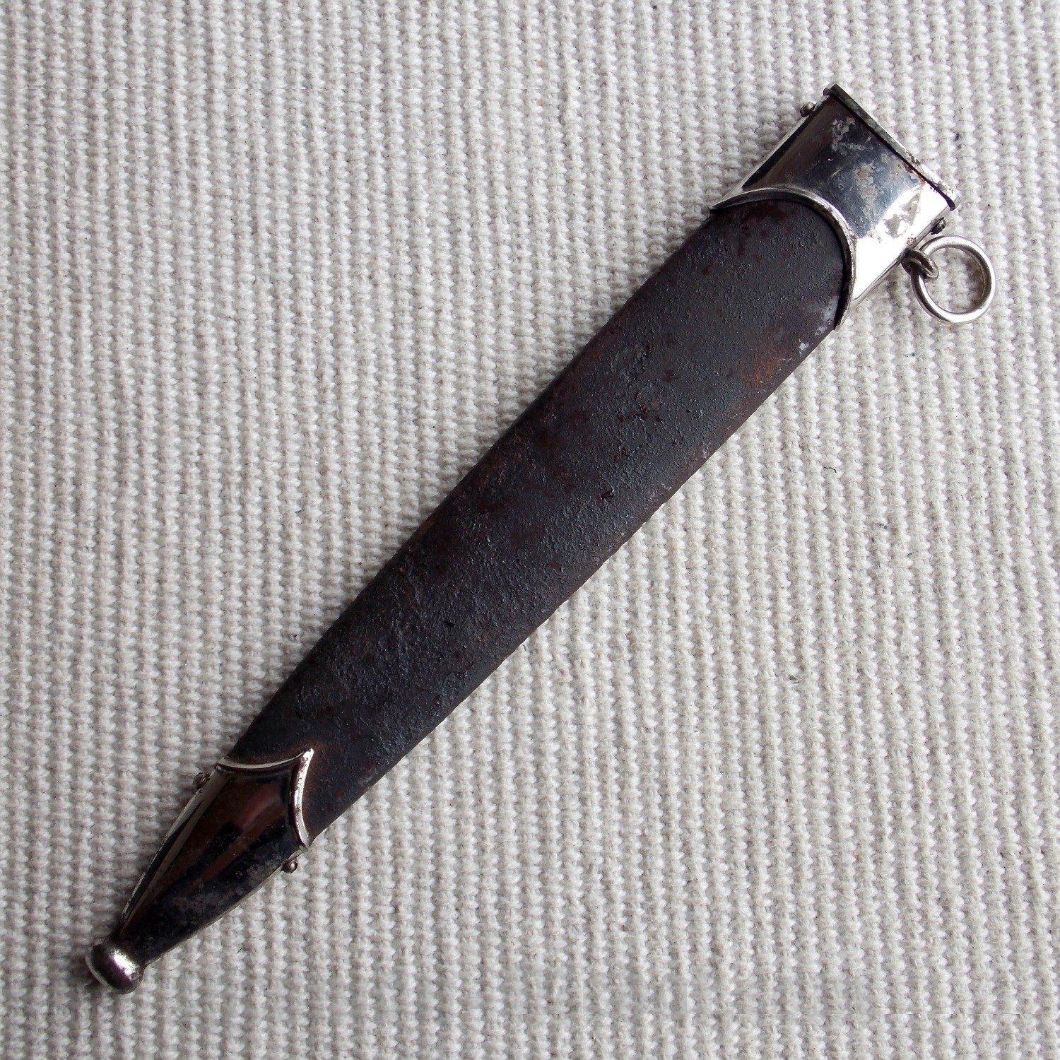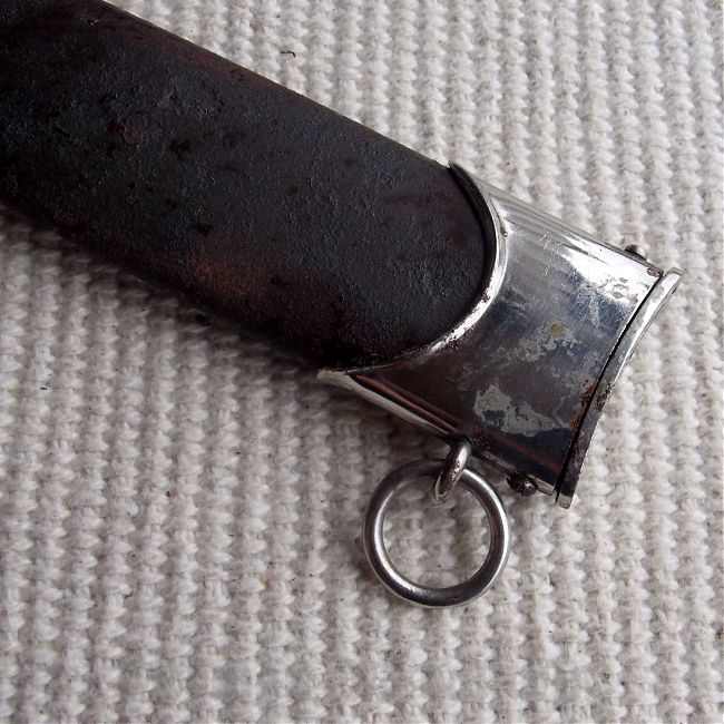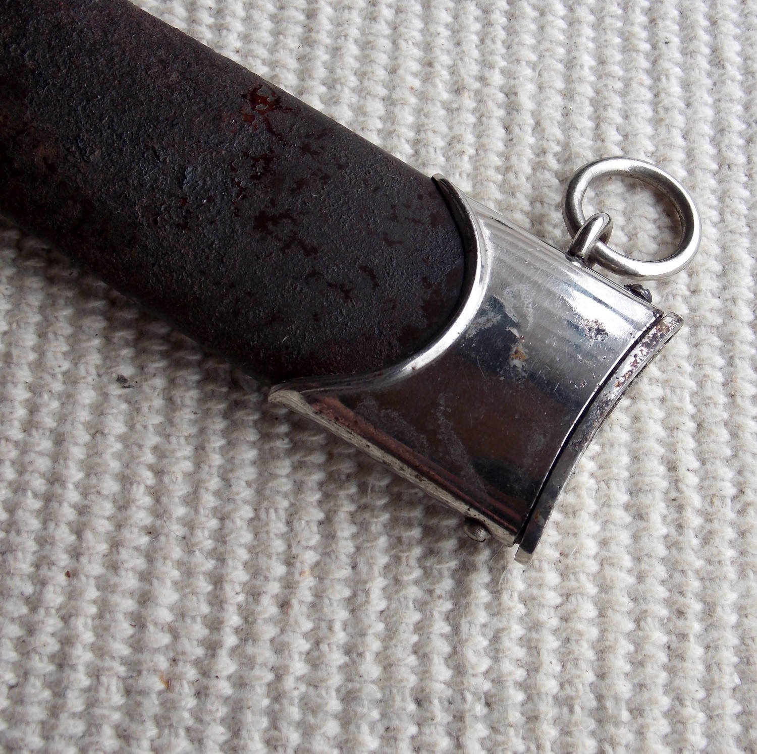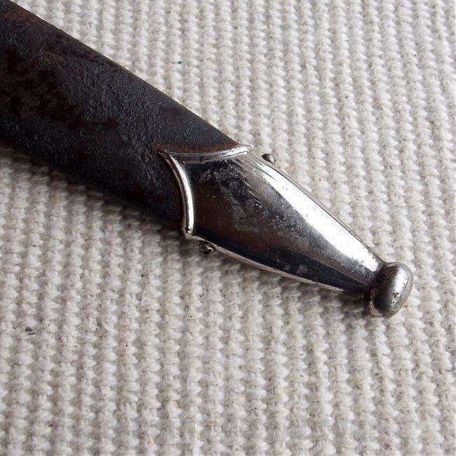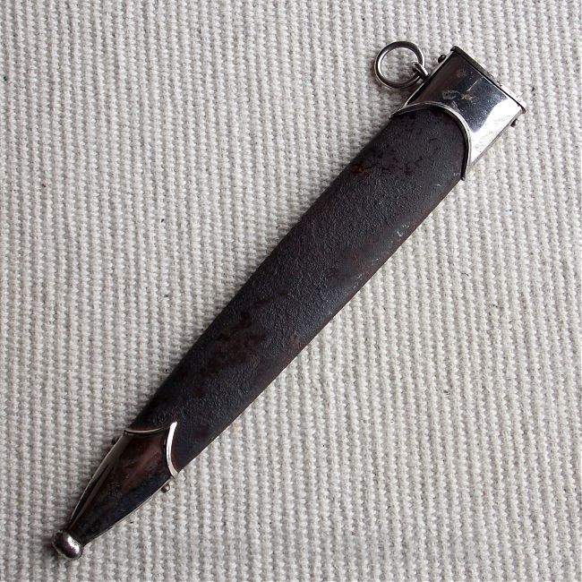 Ножны стальные, в оригинальном коричневом окрасе, с магнитными никелированными накладными наконечником и устьем с кольцом. На поверхности присутствует налет коррозии, но металл прочный, не "трухлявый". Наконечник и устье ножен крепятся  при помощи двух винтов, шарик на наконечнике не деформирован. Внутренняя пружина в рабочем состоянии, клинок кинжала входит плотно, не болтается.