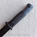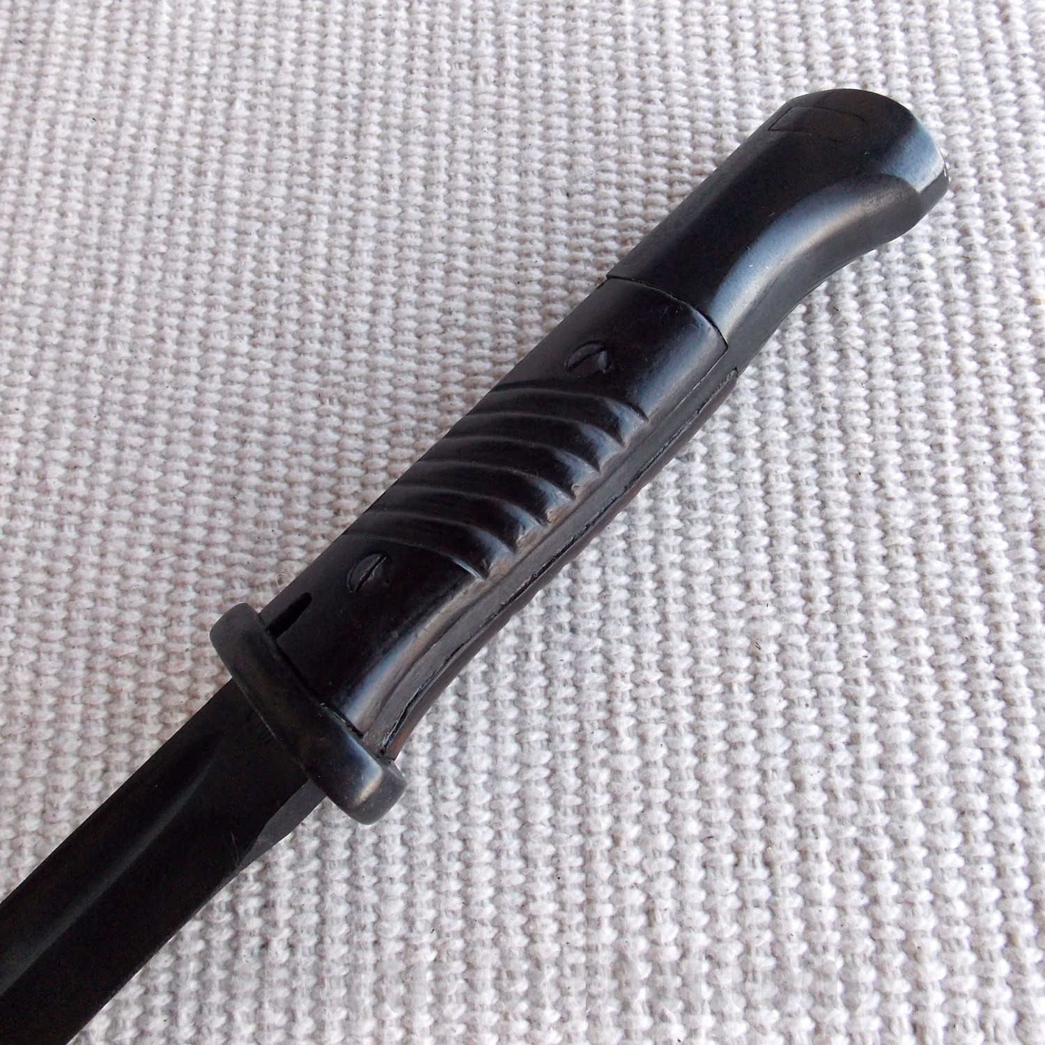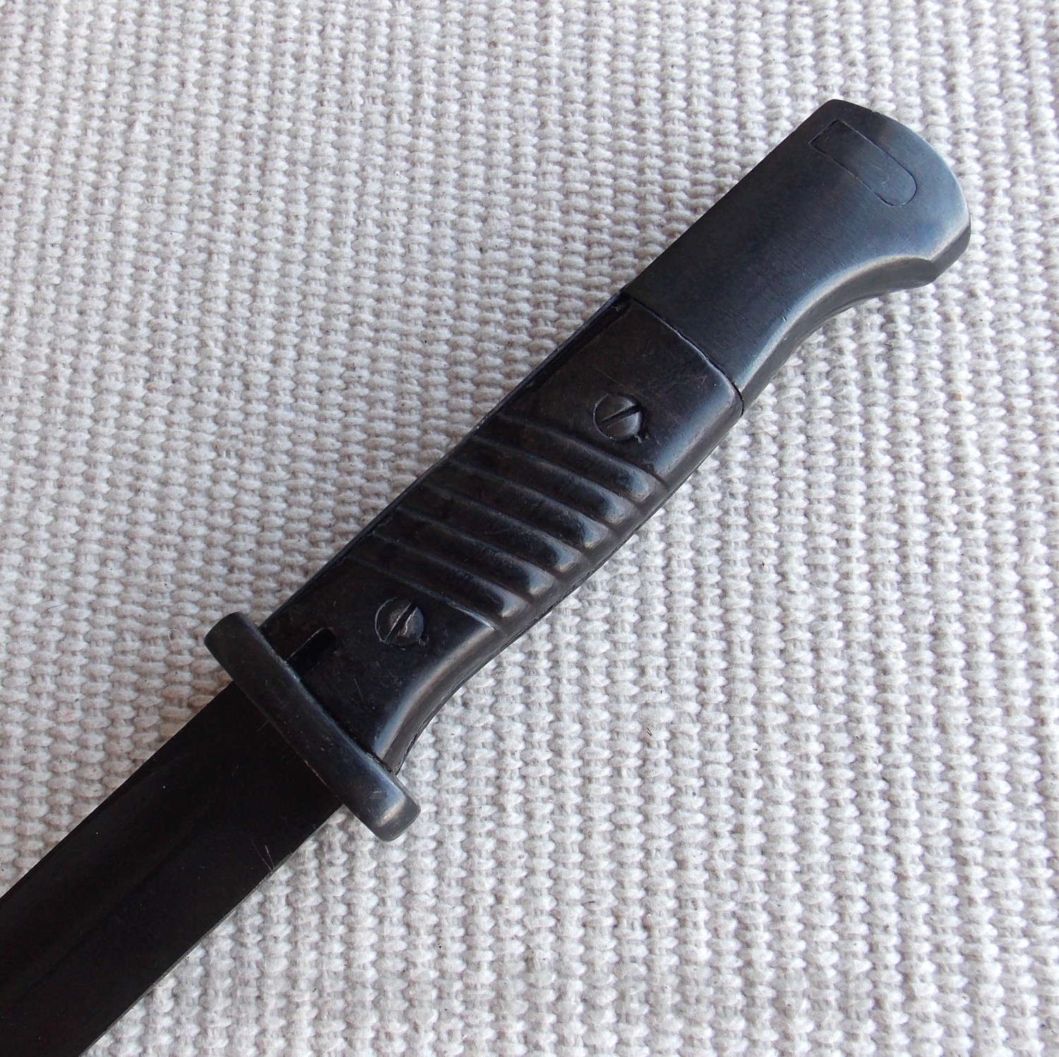 Щечки рукояти бакелитовые с наклонными бороздками, укреплены на хвостовике клинка при помощи двух винтов. В головке рукояти располагается Т-О образный паз и подпружиненная кнопка, предназначенные для фиксации штыка на шине винтовки. Крестовина рукояти стальная, короткая, без кольца.