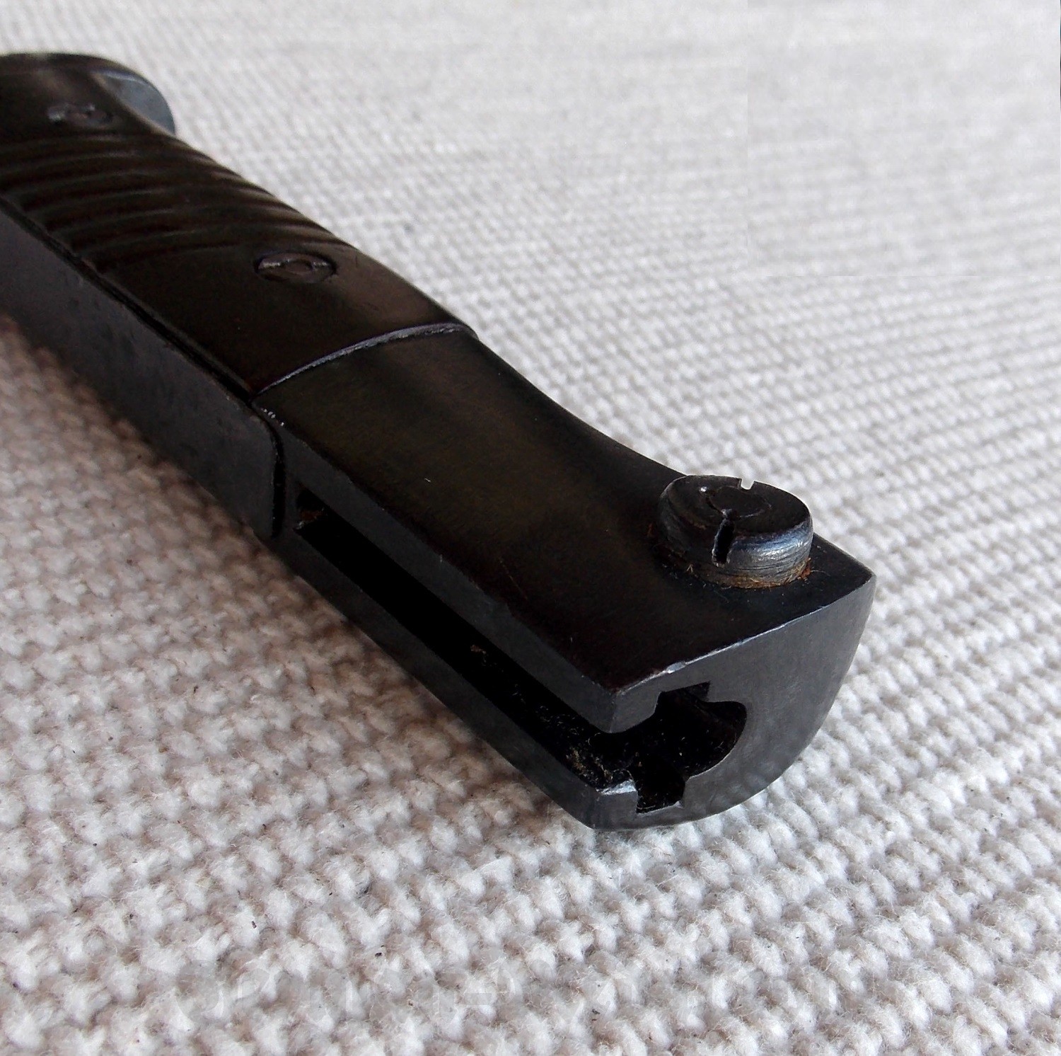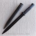 Клинок стальной, прямой, однолезвийный, с одним широким долом с обеих сторон, воронёный, в идеальном состоянии.