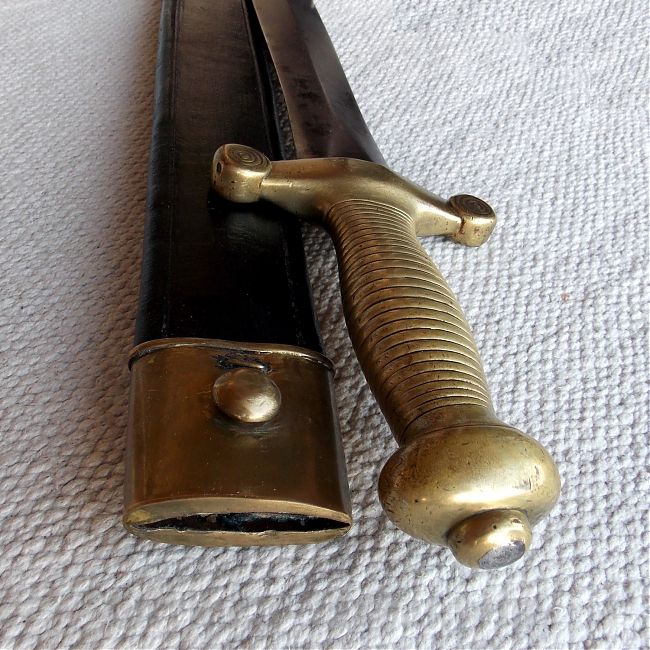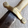 Эфес латунный, цельнолитой, состоит из рукояти и крестовины. Рукоять бочкообразная, с поперечными желобками. Головка рукояти овальной формы с заклёпкой, выполненная в форме полукруглой шляпки. Крестовина прямая с круглыми концами.